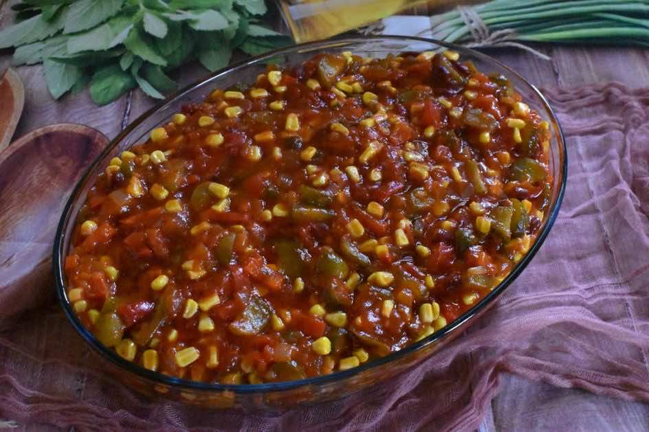 - W tym czasie, co mięso się piecze robimy sos. Cebule obieramy, drobno kroimy, pod smażymy na rozgrzanym oleju. Do cebuli dodajemy obrane z nasion, pokrojone w paseczki papryki oraz w kostkę ogórki i odlaną z zalewy kukurydzę.