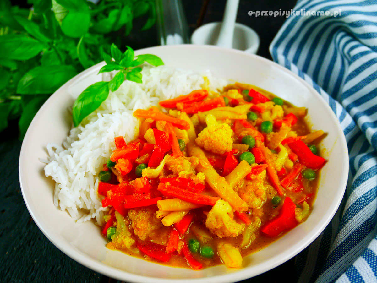 Warzywa w sosie curry to przepis na dietetyczny, zdrowy, wegański obiad. To szybkie danie podajemy z ulubionym ryżem np. basmati lub makaronem ryżowym.