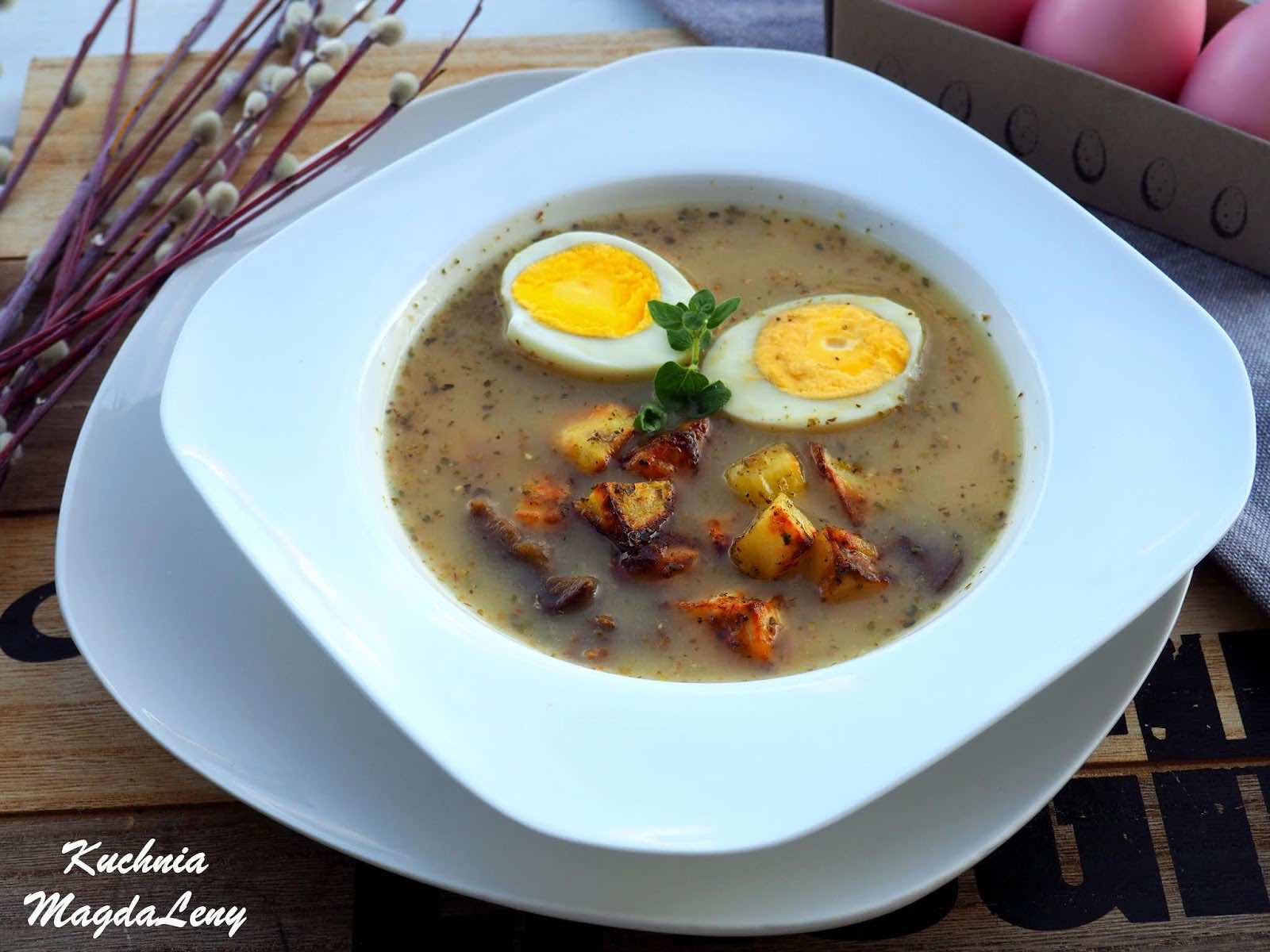 Żurek wielkanocny podany z jajkiem i pieczonymi ziemniaczkami. Zapraszam Was do wypróbowania tego przepisu na Wielkanoc.