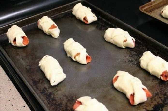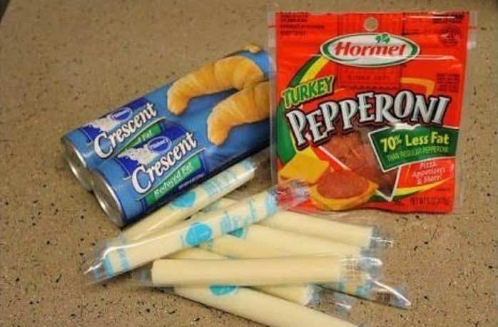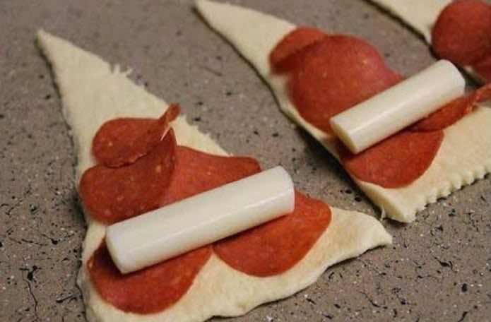 Zaczynamy przygotowanie od pokrojenia ciasta na trójkąty. Następnie układamy na nich parę plasterków pepperoni i ser. Jeśli nie masz sera mozzarella w takich paluszkach, to wystarczy kupić go w plasterkach i zwinąć.