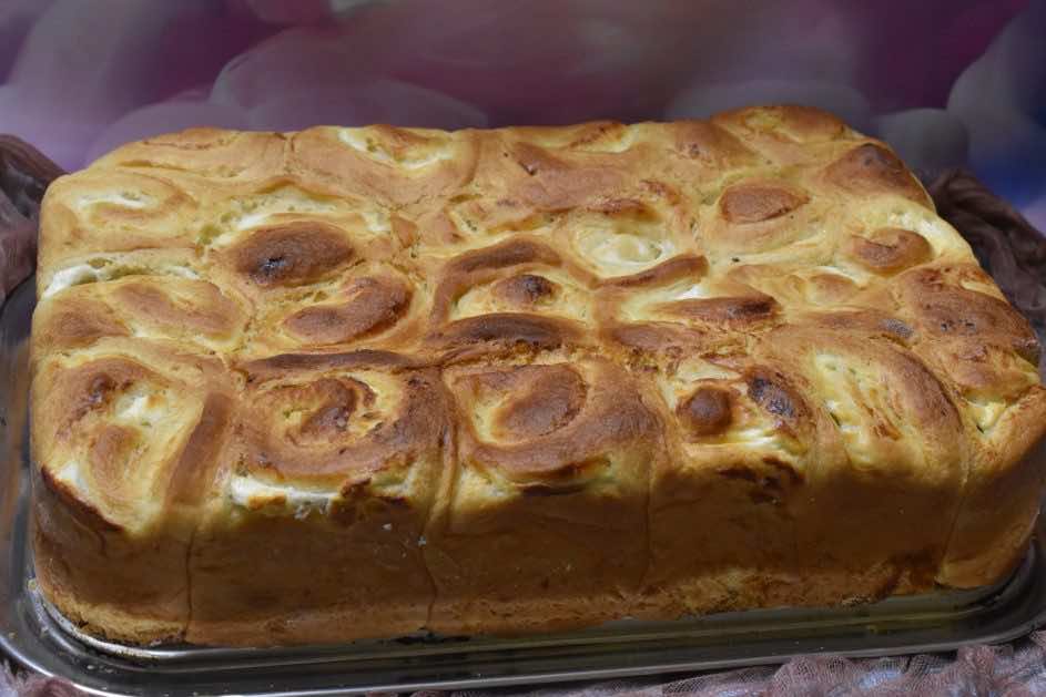 - Po wyrośnięciu ciasto rozwałkowujemy, nakładamy masę twarogową następnie zrolować, pokroić (około 10 cm) i ułożyć na blaszkę pokrojoną częścią do góry.