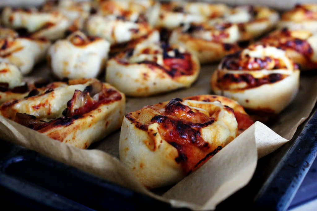 Pizzerinki w formie zakręconych ślimaczków. Możemy do nich użyć dowolnego nadzienia. U mnie z szynką, salami, pieczarkami oraz żółtym serem. Są pyszne i rozchodzą się w tempie ekspresowym, więc warto przygotować podwójną porcję :-) Świetna przekąska na imprezę lub wieczorną kolacje.