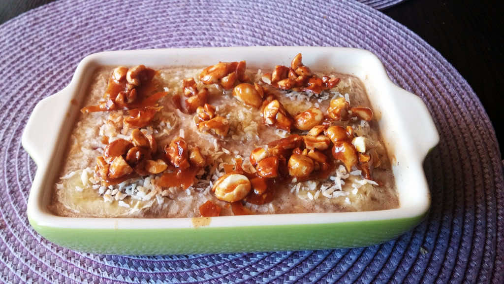 Owsianka zapiekana w piekarniku z bananem i karmelizowanymi orzechami ziemnymi. Pyszna i zdrowa propozycja na śniadanie.