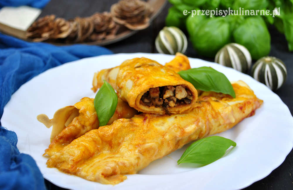 Przepis na pyszne naleśniki z farszem z pieczarek i kurczaka, zapiekane w piekarniku. Z podanych proporcji wychodzi ok 12 sztuk.
