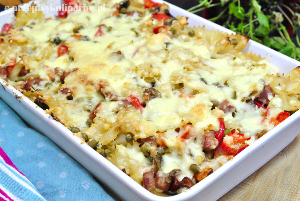 Zapiekanka z makaronem, kiełbasą i pieczarkami