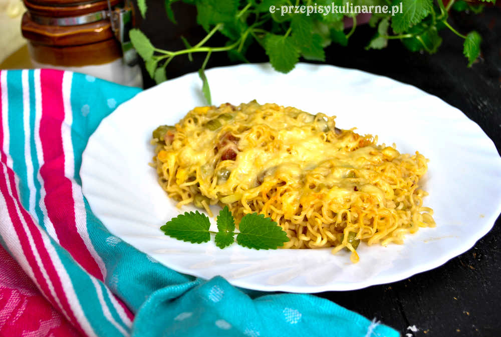 Kiedyś robiłam sałatkę z zupek chińskich, teraz przyszedł czas na zapiekankę. Zapewne niektórzy skrzywią się na samą myśl, że można jeść zupki chińskie, bo przecież takie niezdrowe, ale nic na to nie poradzę, że bardzo je lubię i raz na kilka miesięcy pozwalam sobie je przygotować. A taka zapiekanka jest naprawdę pyszna