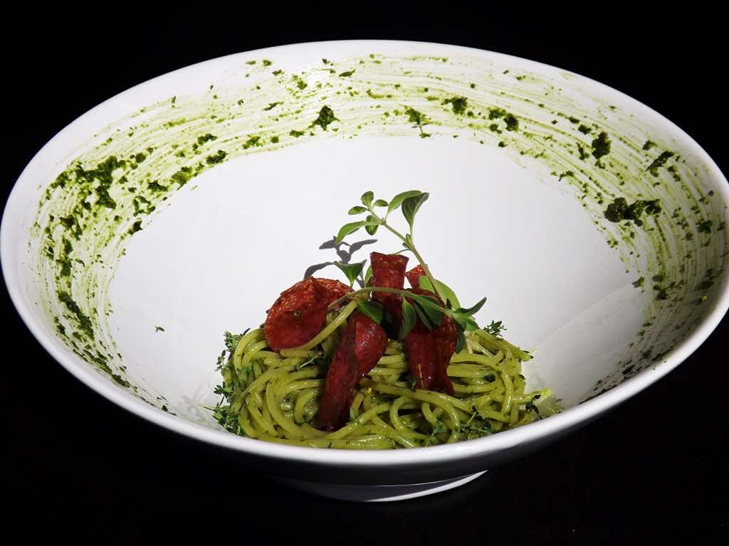 Zielone spaghetti z chipsami z salami