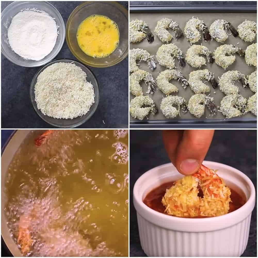 - Krewetkę zamocz w mące, jajku i na koniec wiórkach.