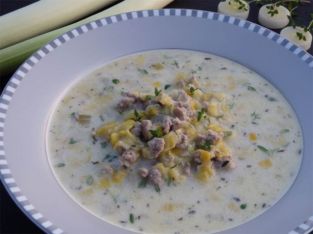 Zupa z pora z dodatkiem mięsa mielonego jest bardzo prosta w przygotowaniu. Jest gęsta i bardzo pożywna więc doskonale sprawdzi się gdy nie mamy czasu na przygotowanie drugiego dania. Do zupy dodałam ser cheddar i zabieliłam ją śmietanką ale zamiast tych składników można dodać także serki topione.