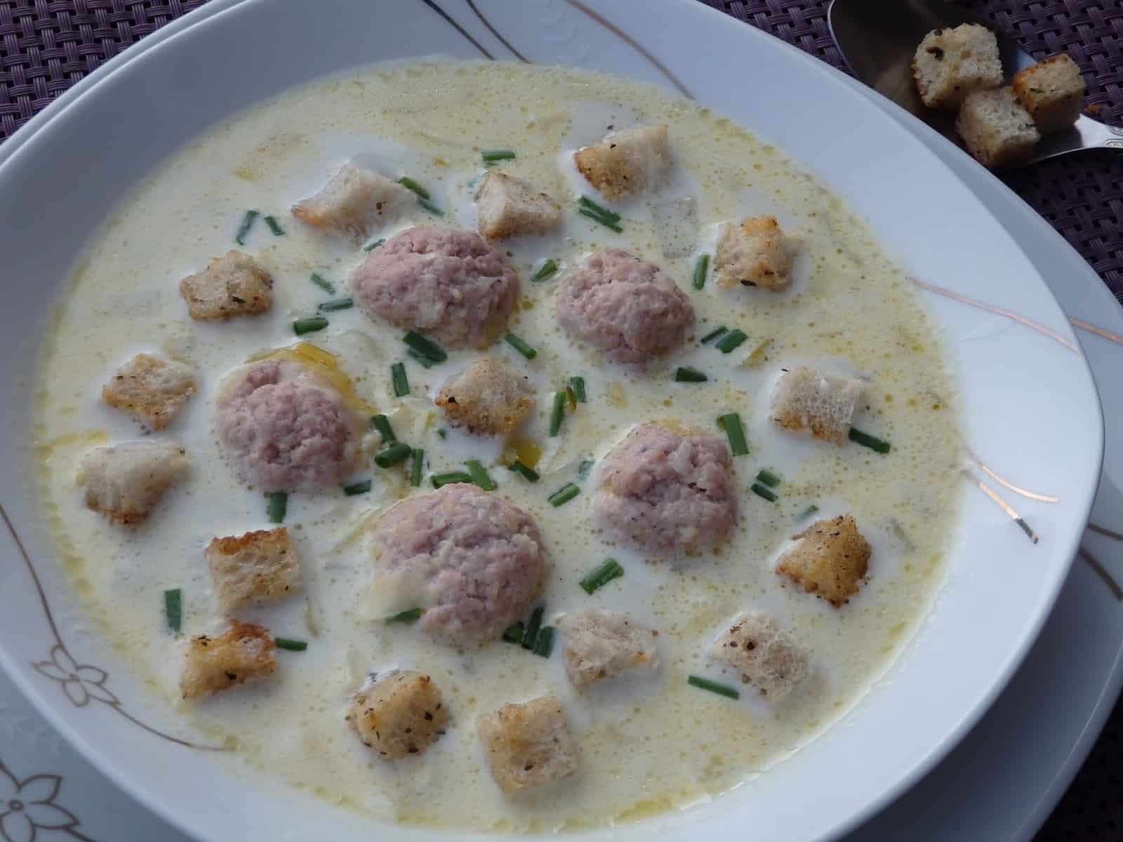 Polecam zupę serową z porem i pulpetami, jest bardzo smaczna i pożywna. Na blogu jest już jeden przepis na zupę serową z serkami topionymi,  ta jest bez serków topionych za to z wyrazistym w smaku cheddarem. Oczywiście zupkę serową podałam tradycyjnie z grzankami.